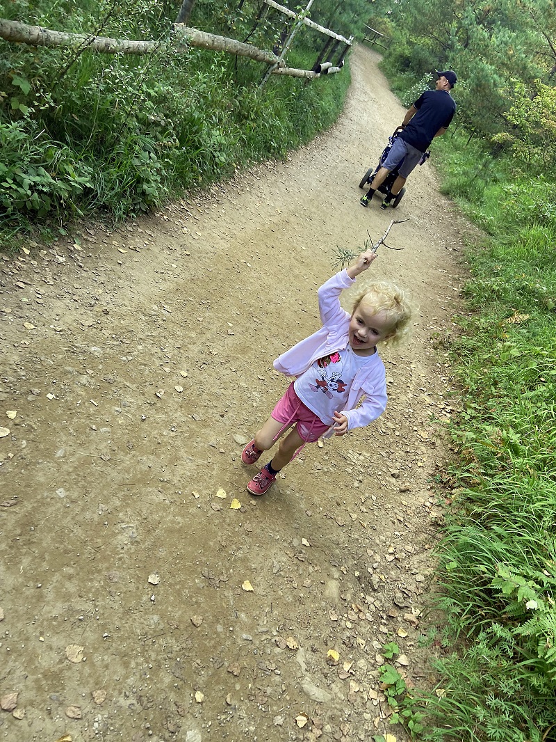 Drugi wariant wycieczki, z którego możecie skorzystać macie pokazany w całej okazałości na dole na mapce. Jest to trasa, jaką my poszliśmy. Z parkingu (wtedy jeszcze nie wiedząc o drodze zaczynającej się na nim) udaliśmy się do ronda, gdzie jest oficjalne wejście do Arboretum. Będzie Was tam prowadzić asfaltowa droga aż do łąki przy Zbiorniku Wydra. Po drodze mijacie Zbiornik Gródek, po którym pływają kaczki czekające jak je poczęstujecie czymś dobrym oraz ryby. Nam udało się zobaczyć podobno białego karpia, ogromny był. Ryb tam pływa mnóstwo, Diana była zachwycona. Jeśli zboczycie z drogi, będziecie mogli podziwiać pierwszy zbiornik, którego wody mienią się pięknymi kolorami. Przy zbiorniku Wydra, oprócz znanych wszystkim drewnianych kładek czekają na Was ławki oraz altana z wydrą. Jest to idealne miejsce aby usiąść i nacieszyć oko widokami. Jednak jeśli chcecie powiedzieć WOW, musicie zobaczyć Wydrę z góry. Najlepsze widoki są jakby z naprzeciwka. Czyli musicie stanąć na wprost dwóch Zbiorników. Trzeba zatem obejść Arboretum dookoła. Udając się na górę należy mieć na względzie to, że droga asfaltowa kończy się i nie wszędzie są barierki zabezpieczające przed upadkiem.