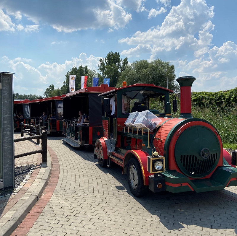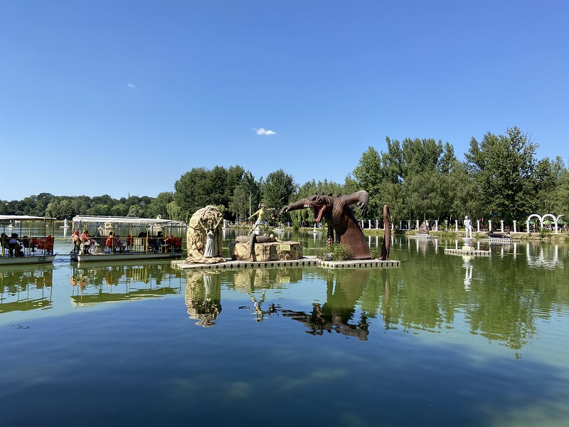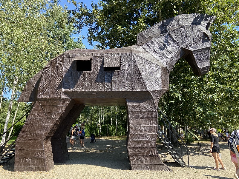 – park mitologii gdzie dodatkowo płatny jest tramwaj wodny i rowerki wodne. Tutaj czekają na nas postacie mitologiczne na… wodzie oraz tańczące fontanny. Pozostałe atrakcje w tym parku to koń trojański, plac zabaw a dla spragnionych mała gastronomia. Między parkiem dinozaurów a parkiem mitologii jeździ bezpłatna kolejka ale jeśli nie załapiecie się na nią, nie martwcie się bo przejście zajmuje kilka minut. Kolejka na pewno będzie atrakcją dla Waszych pociech;
