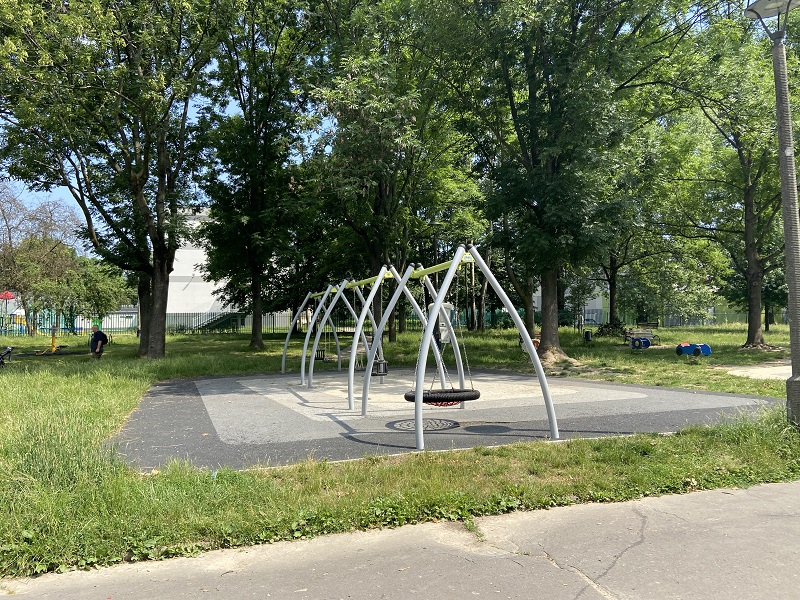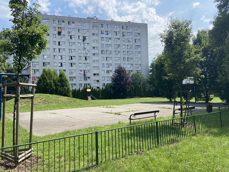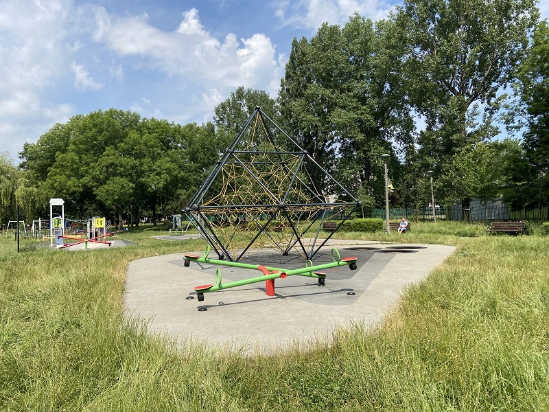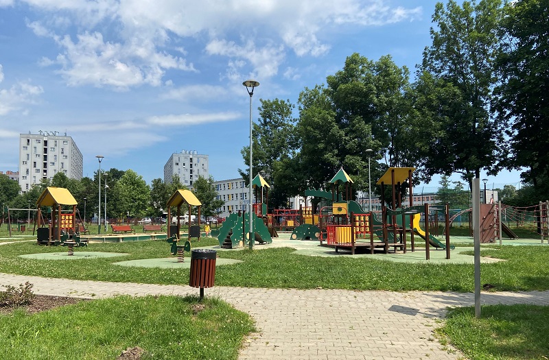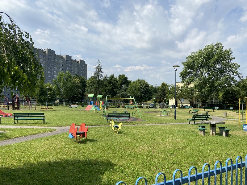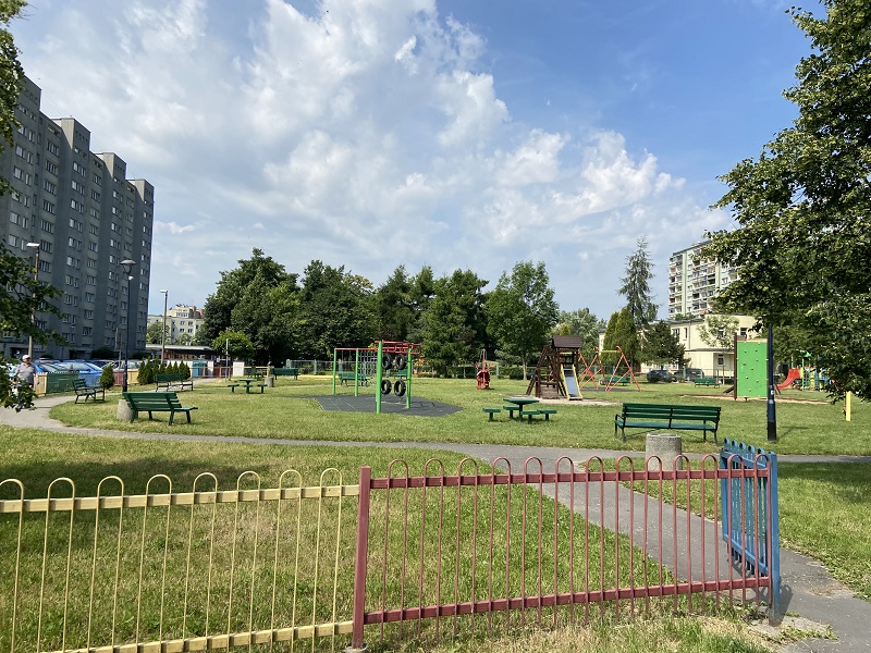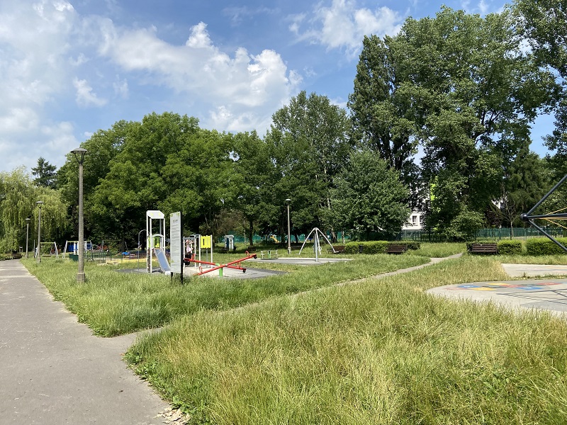 Gdy już się najadłam wyruszyłam na mój spacer od ulicy Kocmyrzowskiej. Teren jest zadrzewiony ale akurat w godzinach porannych słońce tak pada, że cienia jest bardzo mało. Zatem mój spacer przebiega szybciej i ciągle szukam gdzieś cienia. Po drodze mijam ogrom placów zabaw, większość to takie standardowe większe lub mniejsze miejsca. Niektóre są w cieniu, niektóre w słońcu. Zaletą takiej ilości placów zabaw jest na pewno to, że jeśli jeden jest przepełniony można iść na inny. Jeden plac wyróżnia się na tle innych. Infrastruktura jest zielono-żółta i chyba te kolory przyciągają mój wzrok. Jako, że jestem bez Diany, nie przyglądam się żadnemu bliżej.