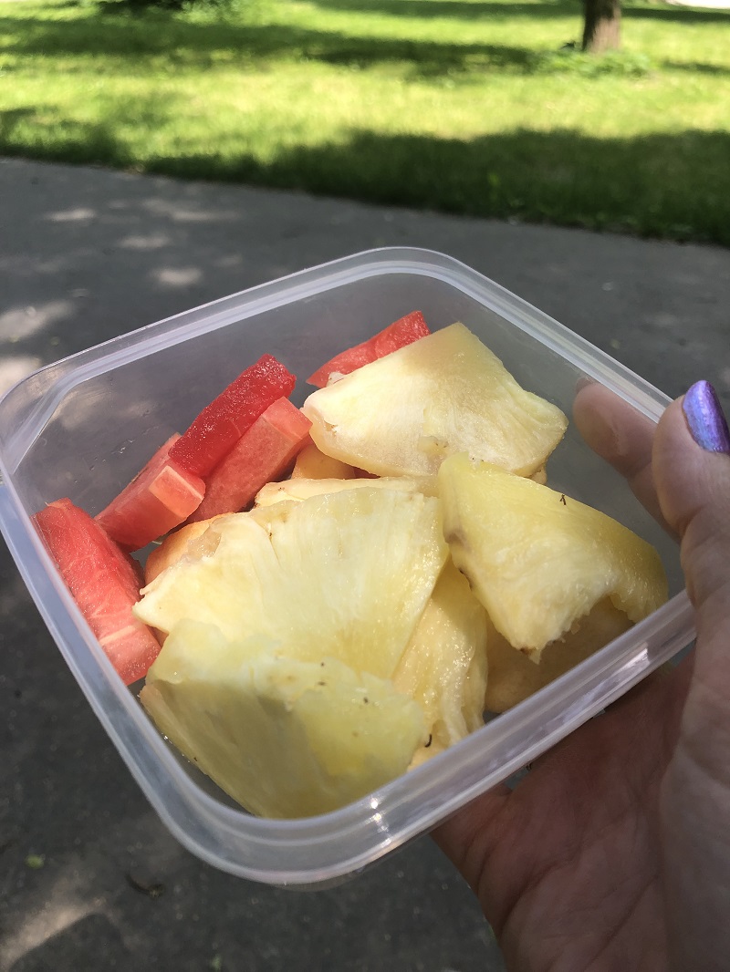 W ciepłe dni zabieram ze sobą również pokrojone owoce dla siebie i Diany. W upalne dni są świetną przekąską i również gaszą pragnienie. Szczególnie polecam arbuzy i ananasy.