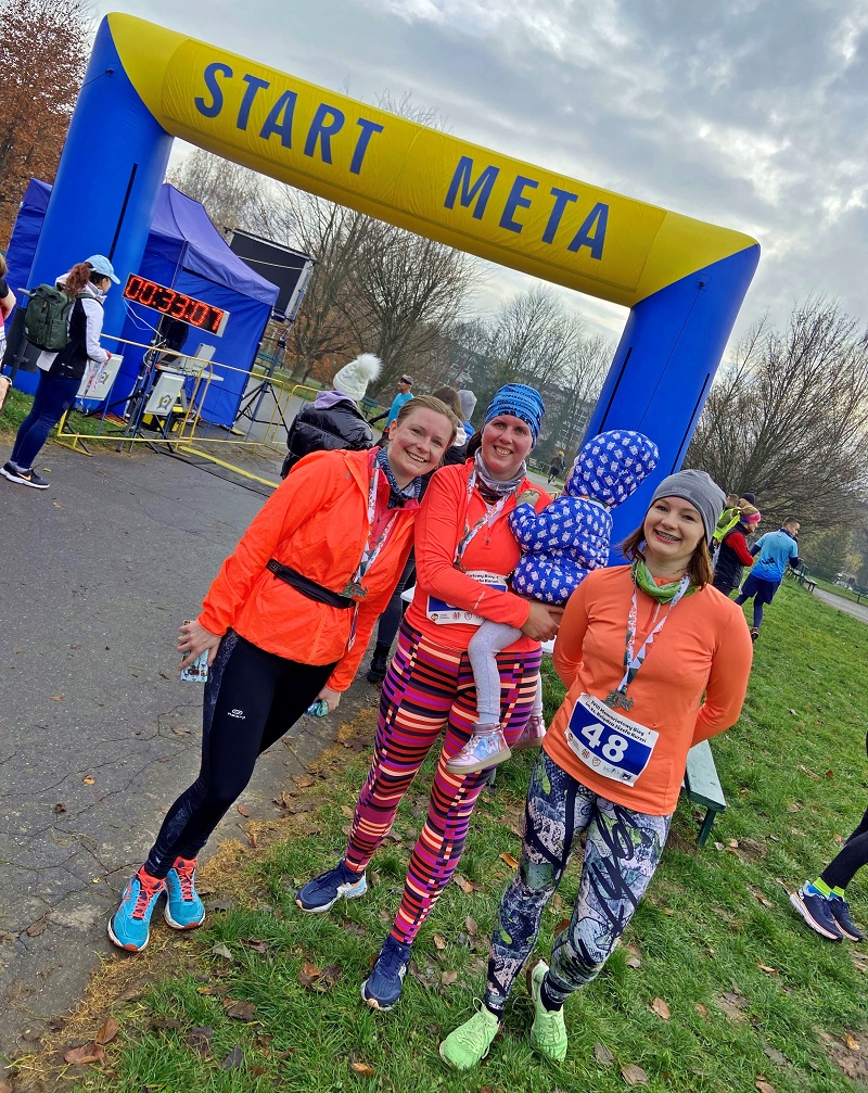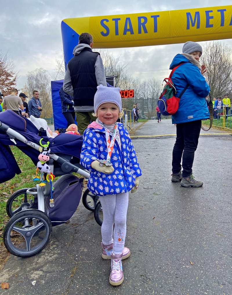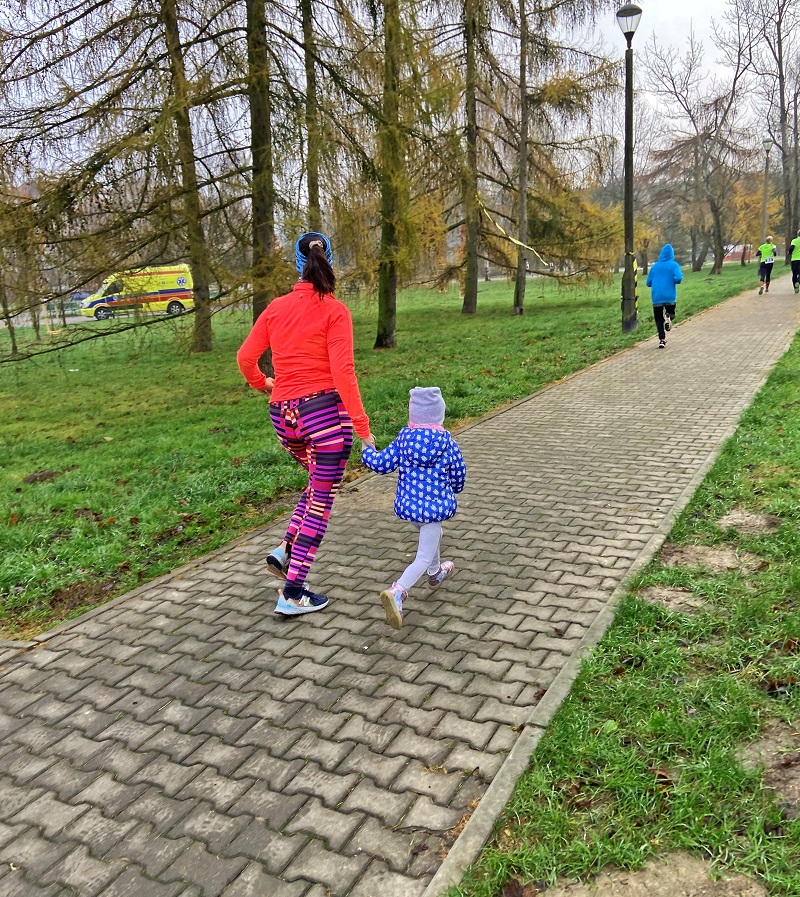 Bardzo nie mogłam się doczekać tych zawodów głównie ze względu na trasę, sporo pod górę i część terenowa. Z tej drugiej ostatecznie zrezygnowano ale wzniesienia zostały. Jak pisałam wyżej jest to miła odskocznia od typowych krakowskich biegowych tras. Ruszamy pod górkę, potem nie jest dużo łatwiej. Jednak cały czas daję radę, biegnę równo, powoli ale cały czas. Bez przerw na marsz. Schody zaczynają się na ostatnim kilometrze. Gdy biorę Dianę od męża. No tak się dogadaliśmy, że zamiast 100 m, biegnę z nią… około 1200 m. Miałyśmy przerwy na marsz, bardzo ją motywowałam bo Diana raz miała siły a raz nie. Wiadomo jak to dziecko. Na początku powiedziała, że ona nie ma siły i nie dobiegnie do mety, miałam czarne wizje, nie wiedziałam co dalej. Byłam zła na męża, że nie zareagował ale w rezultacie dałyśmy radę. Ostatnie metry biegłyśmy z bardzo sympatyczny Panem z NightRunnersów, który razem ze mną dopingował Dianę. W ogóle Diana miała ekstra doping przy mecie, za co dziękujemy. Jestem z niej bardzo dumna, że dała radę tyle przebiec. Co prawda z małymi przerwami na chód ale to w końcu tylko 3-latka i liczy się efekt czyli dobiegnięcie do mety.